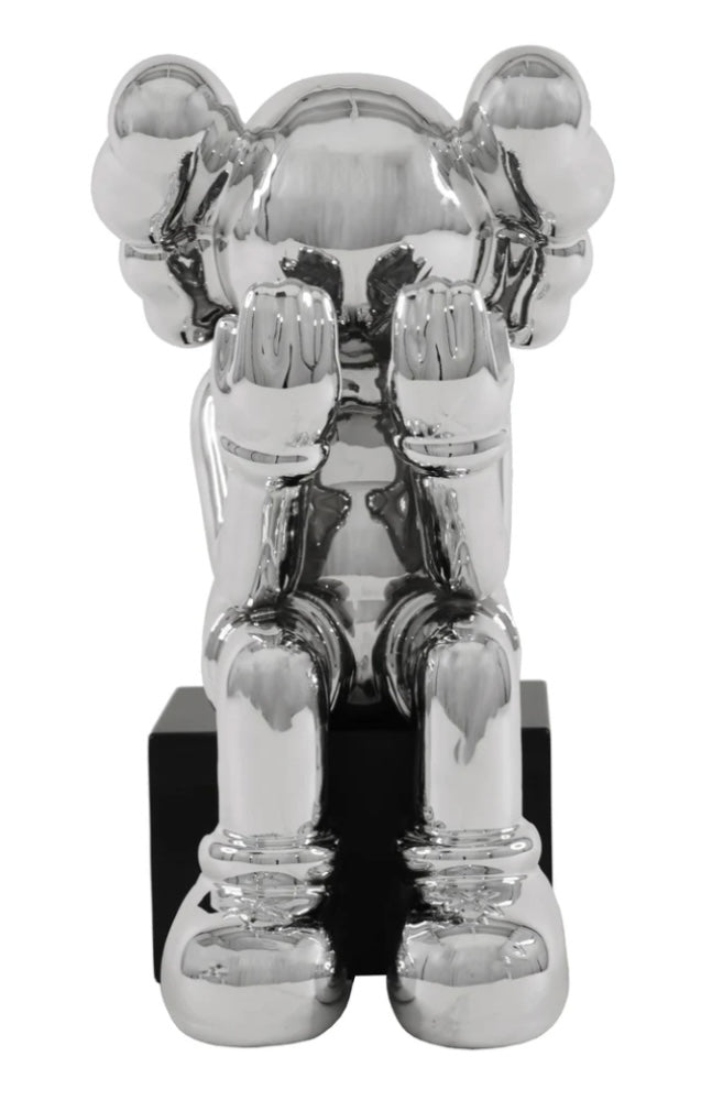 SILVER CHROME KAWS INSPIRED SITTING SCULPTURE